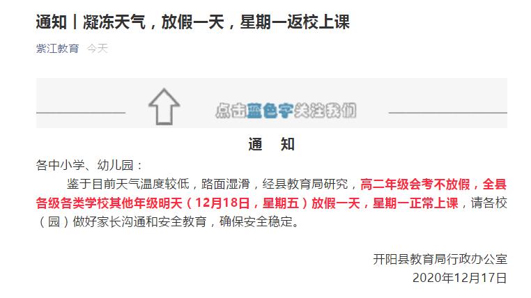 12月17日,据紫江教育微信公众号消息,贵阳市开阳县教育局发布通知:鉴于目前天气温度较低,路面湿滑,高二年级会考不放假,开阳县各级各类学校其他年级明天(12月18日,星期五)放假一天,星期一正常上课。