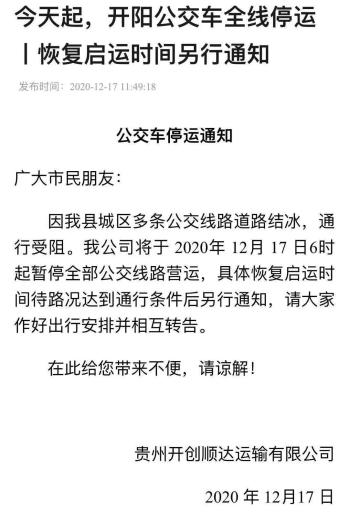 另据开阳县融媒体中心消息,目前,因城区多条公交线路道路结冰,通行受阻,12月17日早上6时起暂停全部公交线路营运。