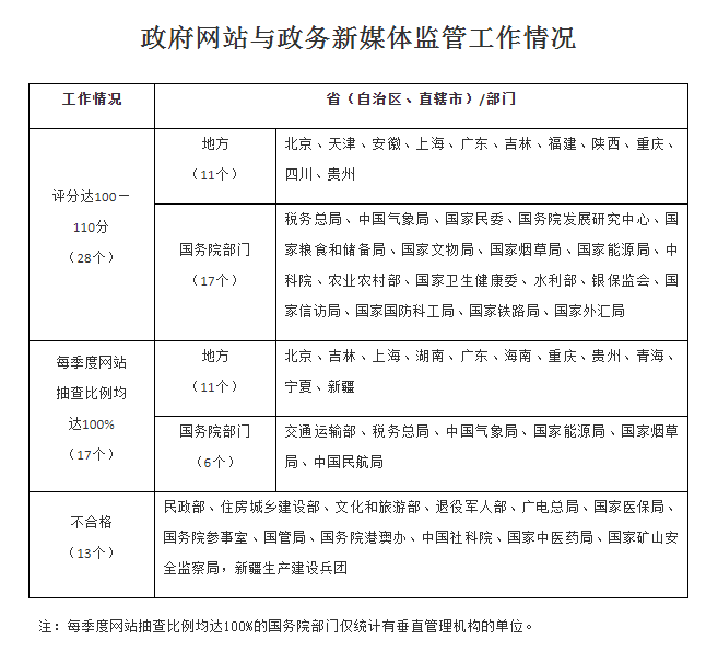 本次检查将各地区、各部门政府网站和政务新媒体监管工作纳入考评。总的看,各地区、各部门积极落实监管责任,加强监督考核,基本实现常态化监管。其中,北京、天津、安徽等11个地区得分靠前;税务总局、中国气象局、国家民委等17个国务院部门得分靠前。31个省(自治区、直辖市)和外交部等44个国务院部门均按季度对本地区、本部门政府网站和政务新媒体开展抽查巡查,并向社会公开抽查结果。北京、吉林、上海等11个地区和交通运输部、税务总局、中国气象局等国务院部门每季度网站抽查比例均达100%。江苏、安徽、江西、湖南等地区进一步规范政务新媒体监管,在加强内容建设的同时,关停整合功能重复或相近、长期不更新、用户关注度低的政务新媒体。
