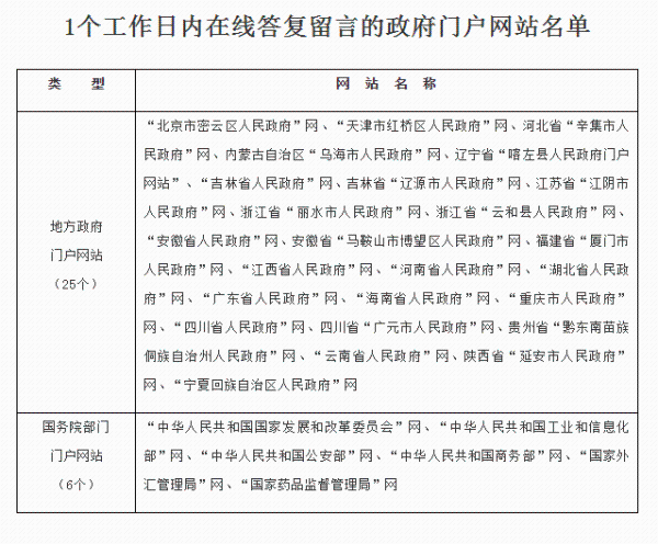 2.1个工作日内在线答复留言的政府门户网站名单