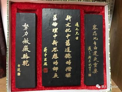 徽墨纪念品:1.努力做徽骆驼;2.蒋中正挽联;3.容忍比自由还更重要。图按:1953年1月10日,旅台绩溪同乡会在台北市泉州街铁路饭店举行茶会,欢迎胡适回台讲学,并祝贺其62岁生日。席间,乡亲恳请胡适题字以为纪念,胡适下笔前以徽州话自言自语:“写些什么好呢?”引起哄堂欢笑。略思片刻,胡适即兴题写了“努力做徽骆驼”六个大字,和绩溪乡亲共勉,并殷切叮咛到会同乡“要坚守徽骆驼、绩溪牛勤劳坚忍的本色”。