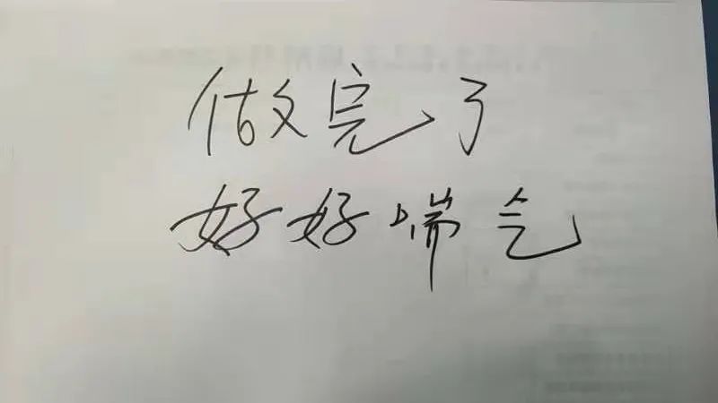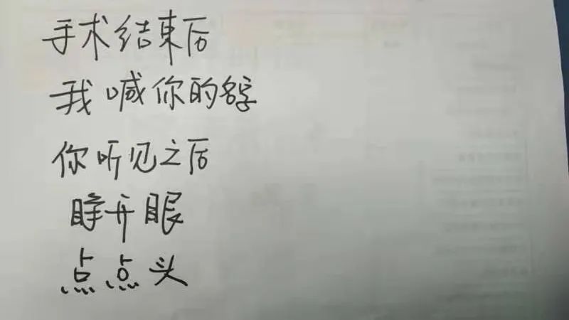 “手术结束后,我喊你的名字,你听见之后,睁开眼,点点头。”谭宇桔用笔写下这几行字,患者醒来了,看见这些字后,点了点头。随后,谭宇桔又写到,“醒的时候,嘴里有个管,帮你喘气,别害怕,好好喘气。”“喘的好,我就把嘴里的管拿出来。”根据患者情况,谭宇桔又写下,“睡觉吧。”几个字,患者看到这些字神情放轻松了许多。