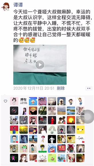 回想起这一幕,谭宇桔心里很温暖。下班后,她发了一条朋友圈,“今天给一个聋哑大叔做麻醉,幸运的是大叔识字,这样全程交流无障碍,让大叔在平静中入睡,不慌不忙,不疼不憋的拔管,出室的时候大叔双手合十的感谢让自己觉得一整天都暖暖的。”她本想记录下这个温暖的瞬间,没想到,同事朋友都点赞。