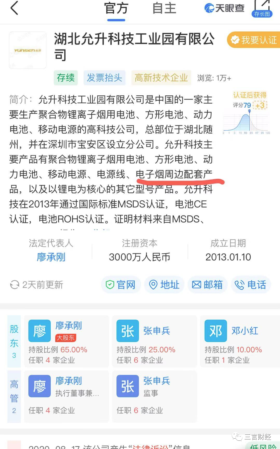 另据天眼查显示,而允升科技是烟用电池生产商,所以大概率是供货商,朱萧木可能拖欠了他们的货款。