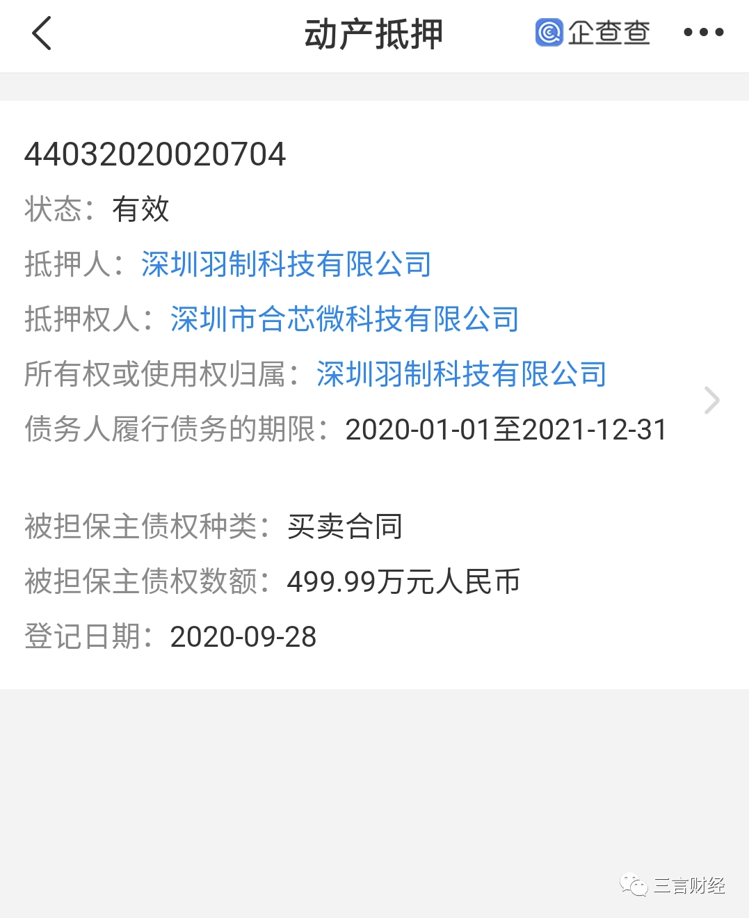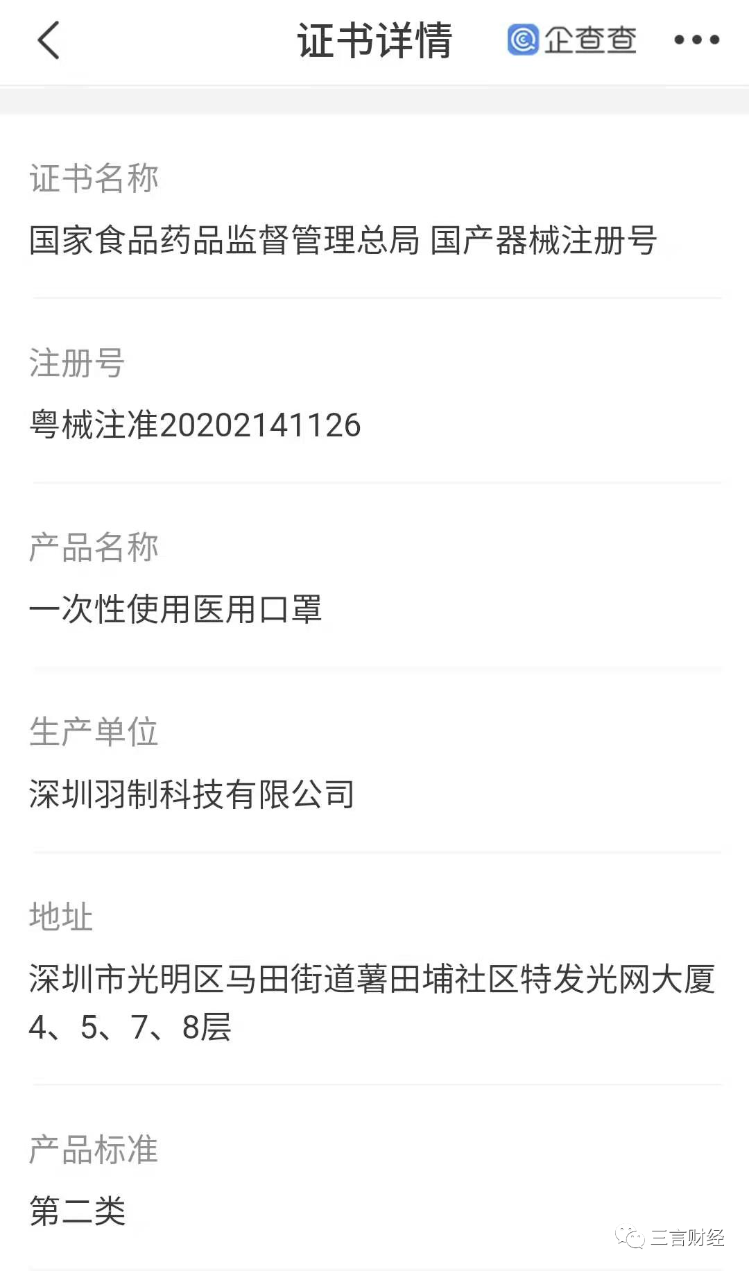 值得注意的是,在动产抵押的设备中还有KN95口罩机。此外,三言财经注意到深圳羽制科技还获得了生产一次性口罩的资质证书,发证日期显示是2020年7月31日。