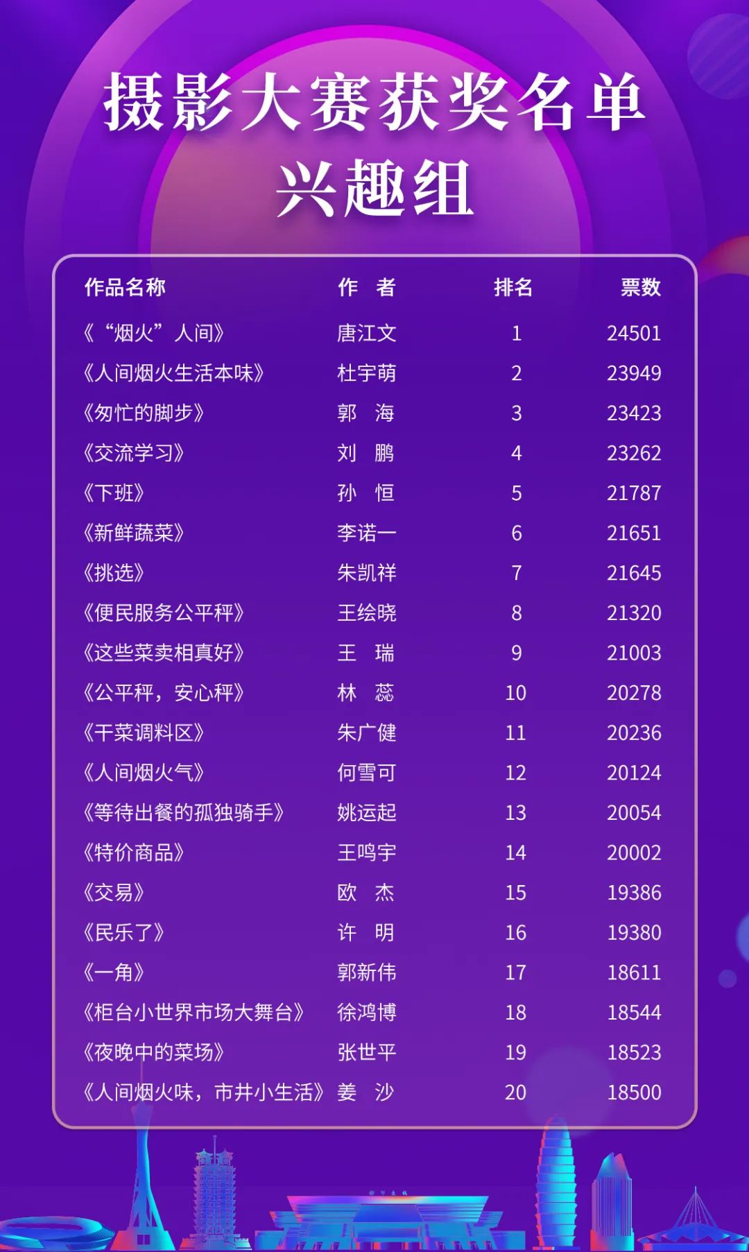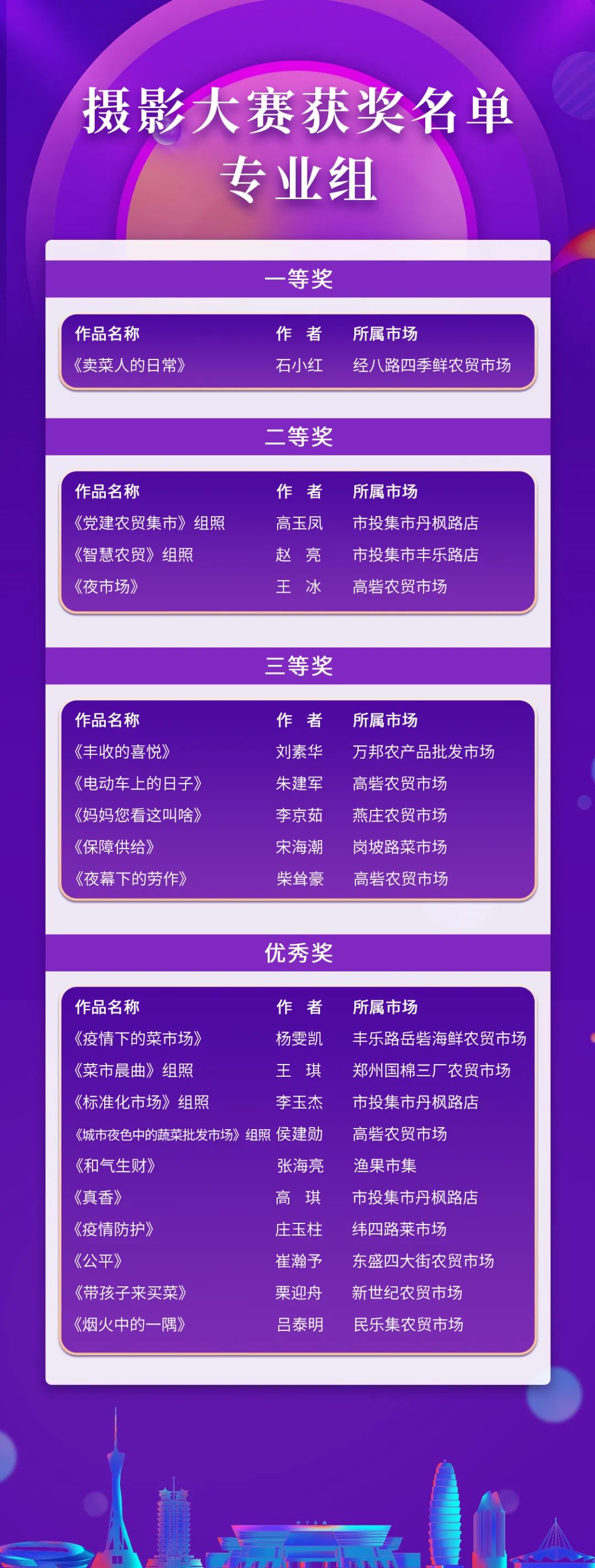 活动举办以来,得到郑州市民的热情参与。经过近两个月的评选,摄影大赛组委会从专业组和业余组参赛的上万幅投稿照片中,评选出一二三等奖,并为作者颁发证书与奖品。此外,这些获奖照片也将在郑州的部分代表性农贸市场中集中展示。