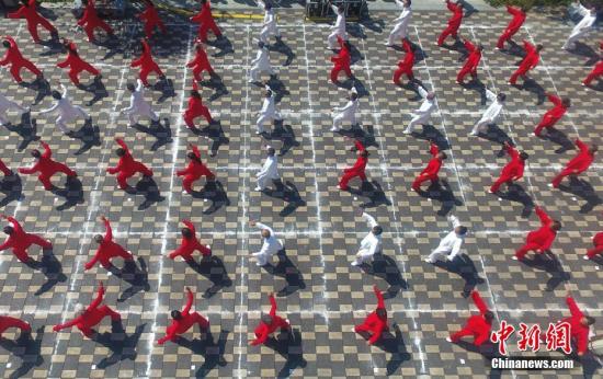 资料图:太极爱好者一起在海边晨练打太极拳。当日,2019海口市暑假太极拳培训暨大展演公益活动在海口市国家帆船基地公共码头举行,吸引近800名太极拳爱好者参加活动。 中新社记者 骆云飞 摄