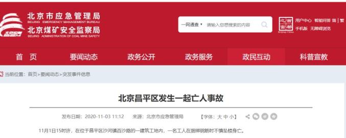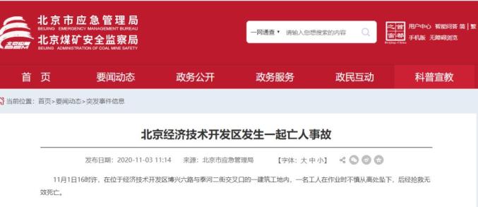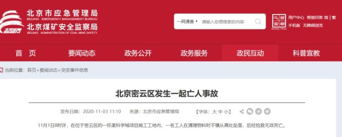 11月1日8时许,在位于密云区的一怀柔科学城项目施工工地内,一名工人在清理物料时不慎从高处坠落,后经抢救无效死亡。
