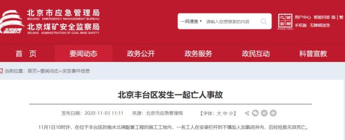 11月1日10时许,在位于丰台区的南水北调配套工程的施工工地内,一名工人在安装栏杆时不慎坠入加氯间井内,后经抢救无效死亡。