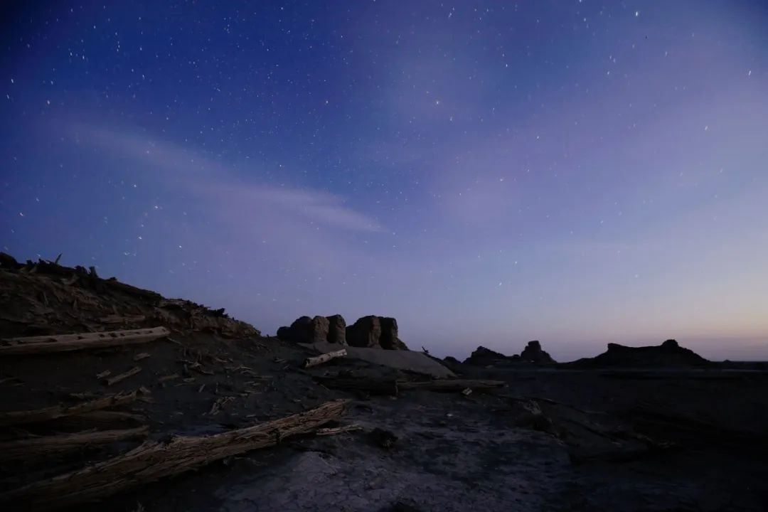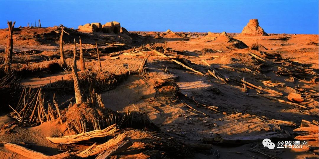 ▲一处的楼兰古城房屋遗址仅剩下枯木