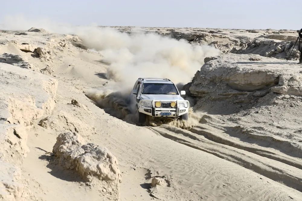 ▲改装的越野车行驶在雅丹地貌区,车后是滚滚黄沙