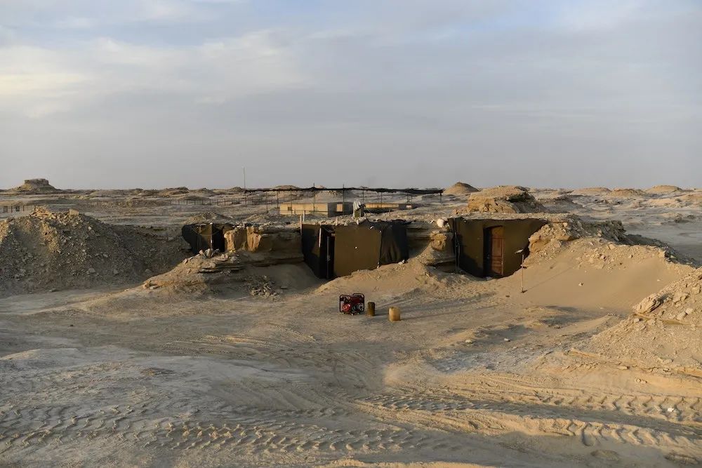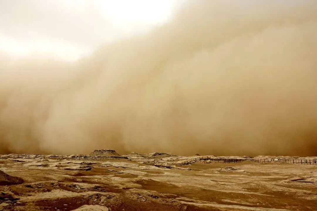 除了高温天气,沙尘暴也是这里的常客。据统计,楼兰古城年均8级大风天数高达80天,浮尘天气115~193天,差不多两三天就有一次沙尘暴。“沙尘暴来了,快跑!快到地窝子里去!”7月的一天,安全员白海峰突然发现远处一堵沙墙快速向他们靠近,他赶紧招呼大家去地窝子里面躲避,大家赶紧放下手中工具,快速跑向宿舍。