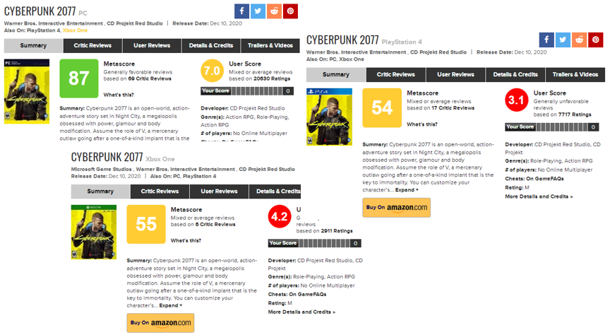 如今,上市一周有余的《赛博朋克2077》评分直线下滑。此前曾为赛博朋克PC版打出9分高分的游戏评论网站IGN对该游戏在PS4/Xbox One平台上的评分仅为4分,Metacritic上对PS4和Xbox One平台的评分更是一度跌至2.8和3.7分。