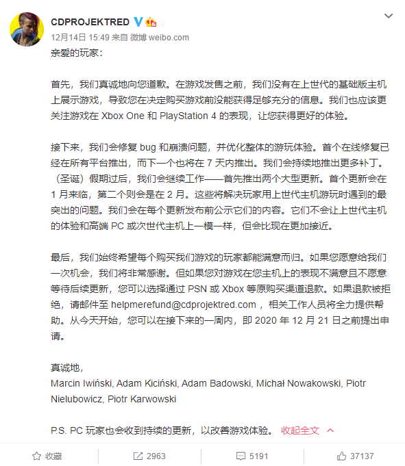 12月14日下午,CDPR在社交媒体平台中公开向玩家致歉,并表示会修复BUG和崩溃问题,优化整体的游玩体验,购买游戏的玩家可以选择原购买渠道退款,申请日期截至12月21日。