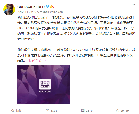 2020年2月26日,公司发布的通知显示,"从现在开始,您的每一款游戏都可在购买后的最多30天内发起退款,无论您是否下载、启动或游玩过此游戏。"也即,玩家在将游戏买到手玩通关后还可发起退款。