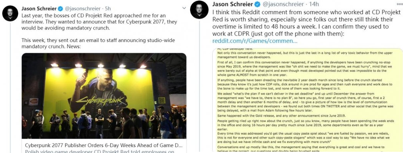 据彭博社记者Jason Schreier爆料,此前为赶上11月的发售日,CDPR员工被强制要求每周工作6天,不仅如此,还有员工表示有很多员工去年就已经开始在晚上和周末加班加点了。