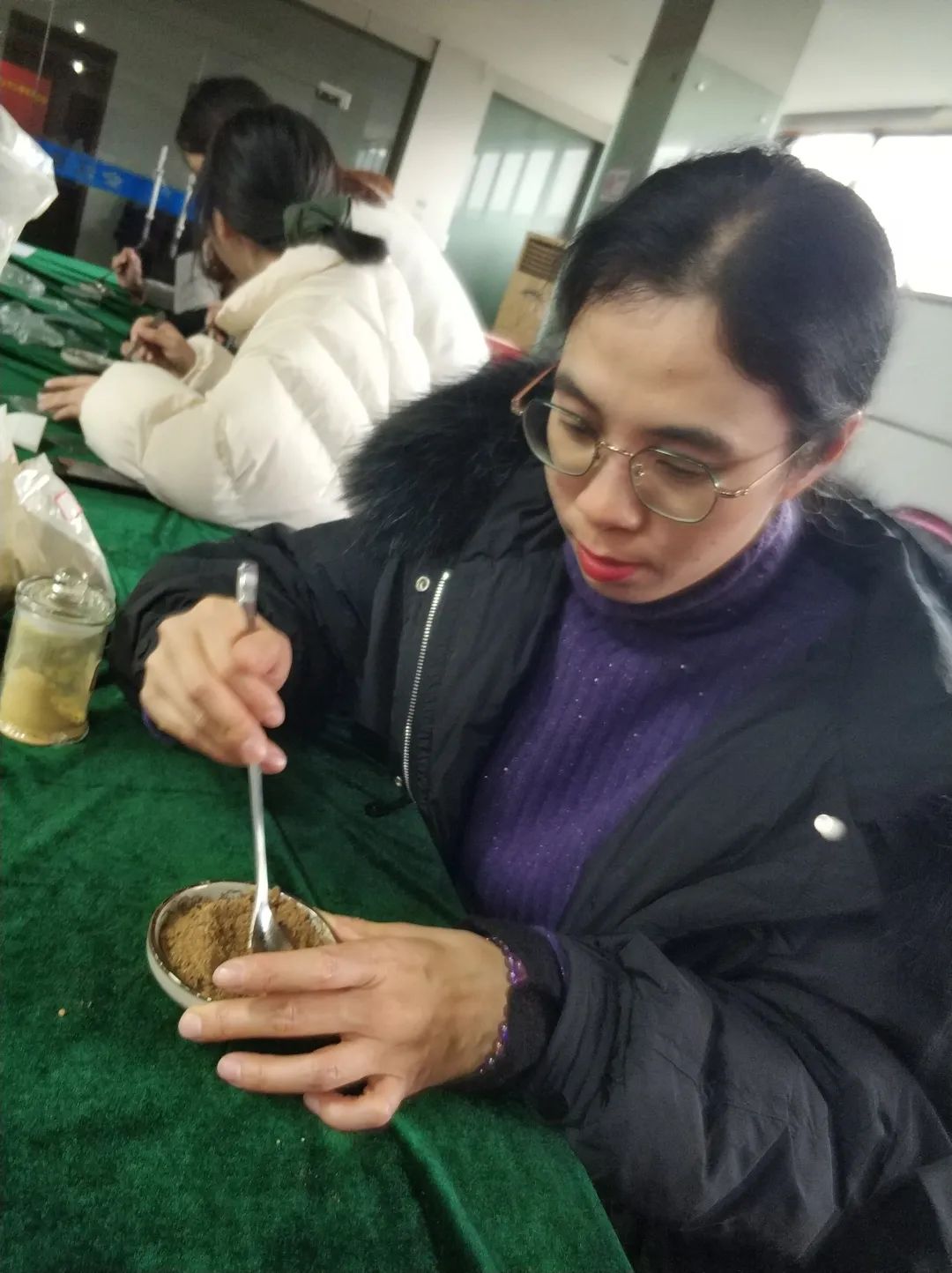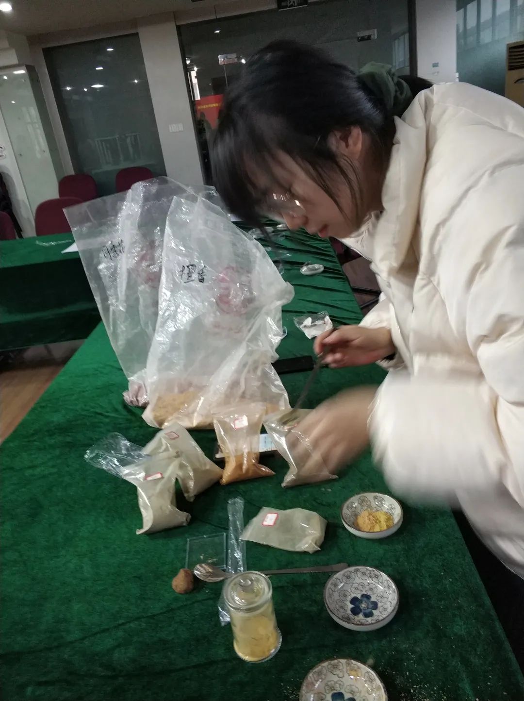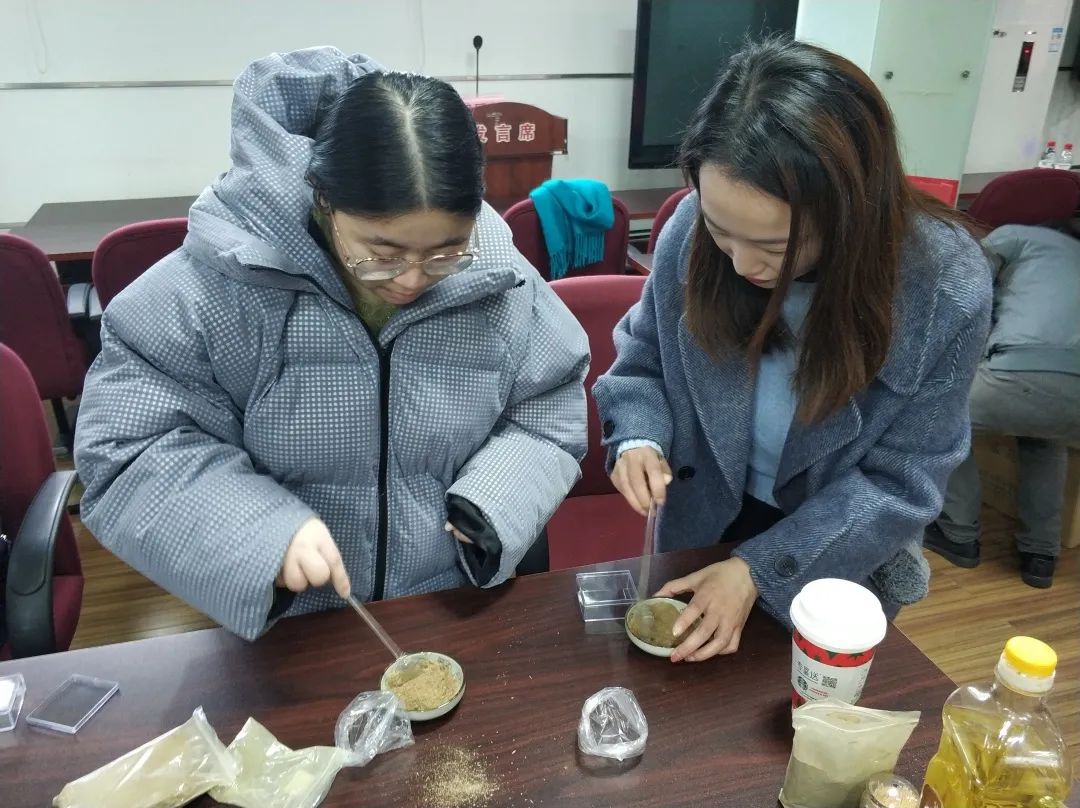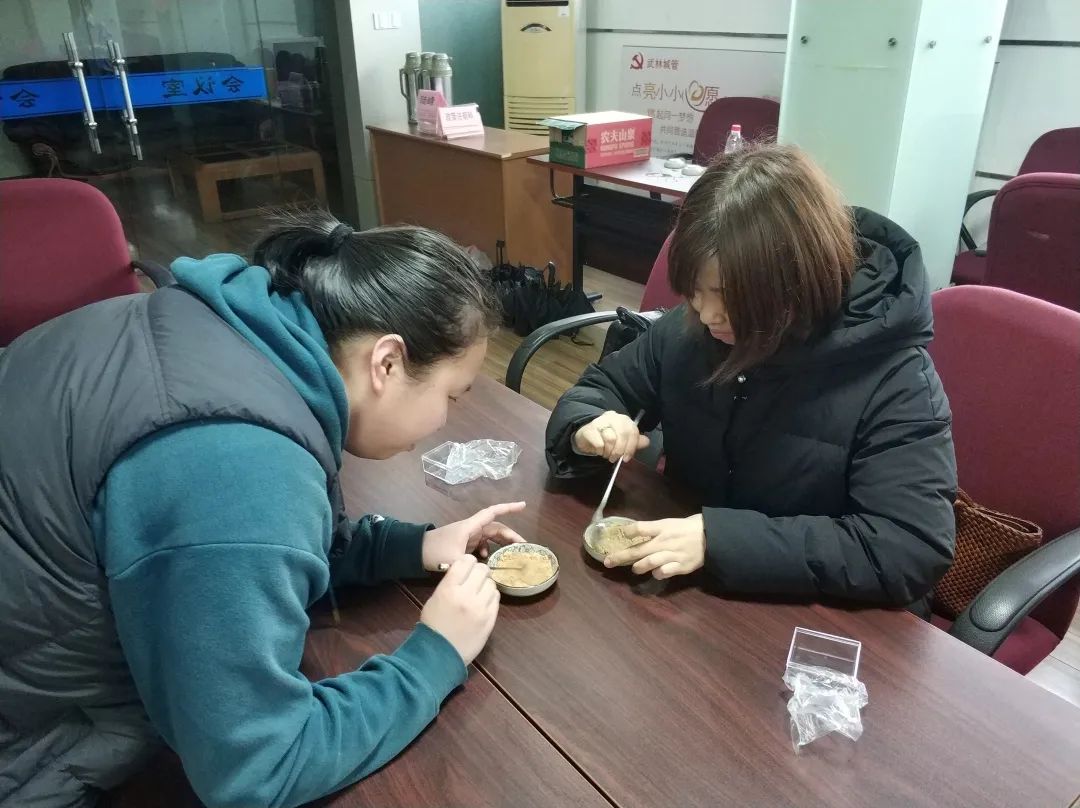 观摩结束,接下来环节就是每位学员开始亲手制作香牌。大家跃跃欲试,摩拳擦掌。第一步:在人手一份的小碟子中加入少量水,挑选三种香粉放入碟中,可供选择的香粉有沉香、檀香、桂花、丁香、艾草、薄荷、月季等等十余种。大家有的人喜欢沉香味为主,有的喜欢以檀香味为主,各有千秋。