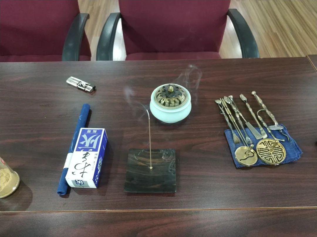 “印香在唐宋时代已经流行,现在的盘香即源自于印香。其制作方法是用印香模、香篆模、框范,压印而成”。随着授课老师的娓娓讲解,大家围在一起,观看了现场演示的印香制作流程:在香炉里倒入适量香灰,作为香篆炉的基底;用香铲打散整理香灰;再用香压将香灰压紧压实;将香粉放入香篆炉中,压成如意的图案,印香即制作完成。