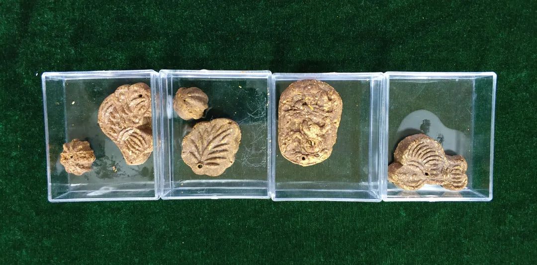 第三步:选一款中意的图案模具,仔细将角角落落刷好油之后,将揉搓好的香料胚子按压进模具中,压紧压实,剔除掉多余的边料,倒扣模具,香牌脱出。至此,一件自己喜欢的手工香牌即完成初步制作。成品形状各有不同,有的做了莲蓬,有的做了葡萄,有的做了龙,有的做了叶子,各式各样,维妙维肖。