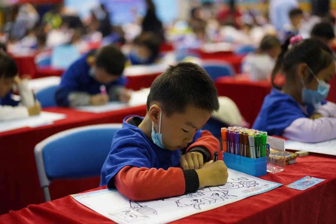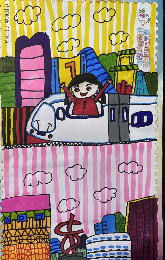比赛正式开始,小朋友们用小小方寸邮票把对城市变化的观察和美丽家乡的热爱描绘成色彩斑斓的画卷。
