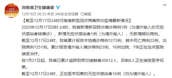 3)2020年12月17日0时-24时,河南省新增新冠肺炎确诊病例1例(为境外输入的无症状感染者转确诊)、新增无症状感染者1例(为境外输入),无新增疑似病例。4)张伯礼:1月底前仍是高危时段,春节返乡要注意这些:少聚集、戴口罩、勤洗手、勤通风;各个有关部门提前安排好今年春节返程休假时间,提前做好预案;医疗卫生部门要随时做好准备,不能掉以轻心。