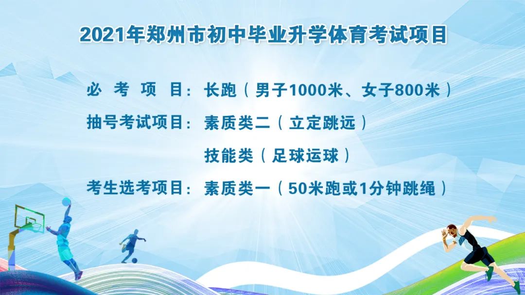2)18日,2021年郑州中招体育考试项目抽号结果出炉。抽号统考项目确定为立定跳远、足球运球。目前郑州市初中毕业升学体育考试分值已提高为70分。3)注意!郑州公租房申请和审核有新变化,审批实现“当日办结”“零跑腿”。