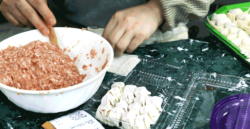 如果有幸能在后厨见到经验丰富的厨师包馄饨,可是一件不可多得的体验。在他们手下,平凡的食材改头换面,被赋予了新的风味。十指灵巧的翻动令人眼花缭乱,而就在着翻转之间,一只又一只圆滚滚的小馄饨就出现了。