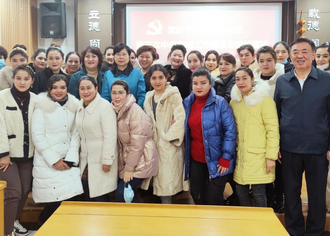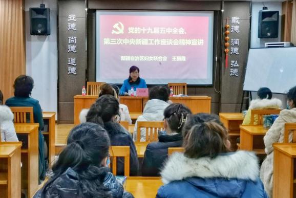 王丽霞从深刻认识全会和座谈会的重大意义,深入学习领会全会和座谈会精神、特别是习近平总书记重要讲话精神的核心要义、丰富内涵、实践要求,坚持以习近平新时代中国特色社会主义思想为指导,聚焦新发展阶段、新发展理念、新发展格局,统一思想、凝聚共识、激发力量、担当作为,以实干赢得美好生活,以奋斗实现精彩人生等方面进行了深入浅出的讲解。并引导姐妹们不断增强对伟大祖国、中华民族、中华文化、中国共产党、中国特色社会主义的认同,铸牢中华民族共同体意识,充分发挥妇女在社会生活和家庭生活的独特作用,始终感党恩、听党话、跟党走。一要勤奋学习长才干。学国家通用语言文字、学法律、学科学、学技能,用新思想、新理论、新知识充实完善自己,增强创业的勇气、创新的锐气、创优的志气。二要立足岗位展风采。大力弘扬劳模精神、劳动精神、工匠精神,做到刀在石上磨、人在事上练,努力成为新时代“最美奋斗者”、成为新疆走出来的“最美古丽”。三要注重家庭树新风。践行社会主义核心价值观,建设好家庭、涵养好家教、弘扬好家风,移风易俗、勤俭持家,崇尚科学、抵制极端,争创“五好家庭”“最美家庭”。四要增进团结促和谐。像爱护自己的眼睛一样爱护民族团结,像珍视自己的生命一样珍视民族团结。人人争做新浙两地代言人,人人争当新浙两地宣传员,积极参加“民族团结一家亲”和民族团结联谊活动,各民族像石榴籽一样紧紧抱在一起。