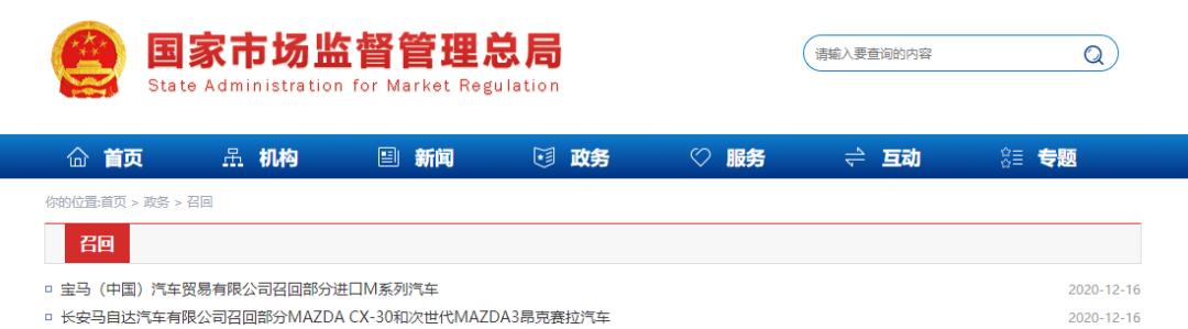 原文标题:宝马(中国)汽车贸易有限公司召回部分进口M系列汽车 | 长安马自达汽车有限公司召回部分MAZDA CX-30和次世代MAZDA3昂克赛拉汽车