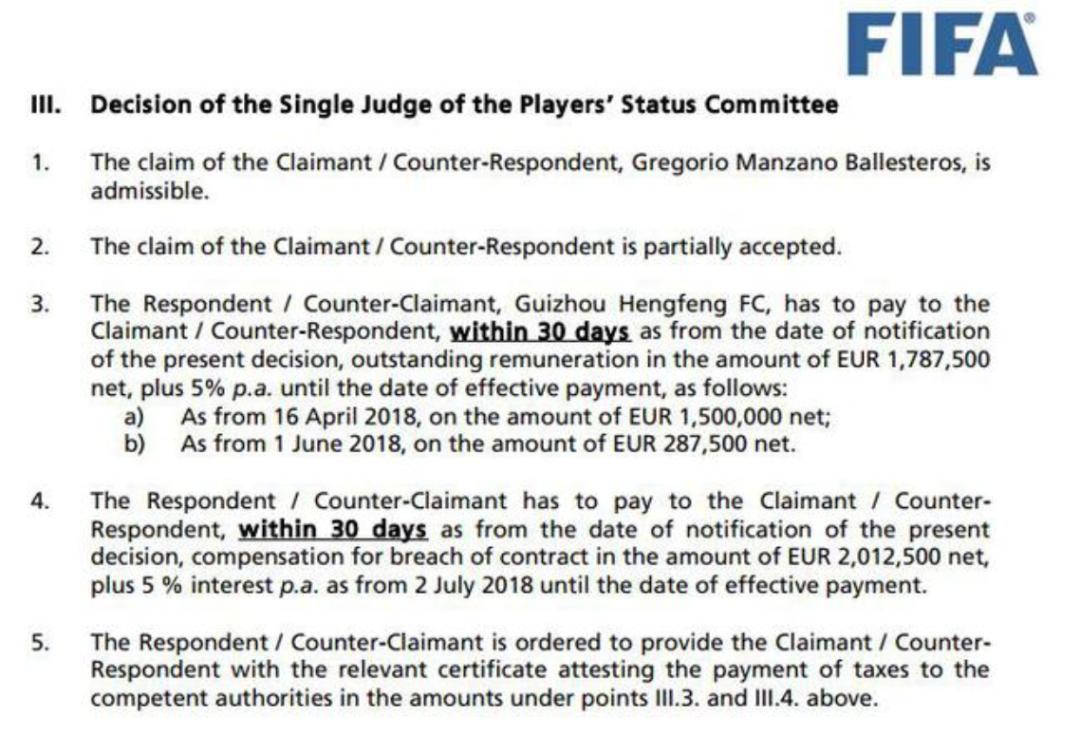 最终经过FIFA的裁决,曼萨诺的大部分申请得到了支持,贵州恒丰因此将在裁决生效的三十天之内,向曼萨诺支付各项赔偿金总计380万欧元(折合人民币约3043万元),并且就欠款向曼萨诺支付每年5%的利息,从2018年7月开始计算。