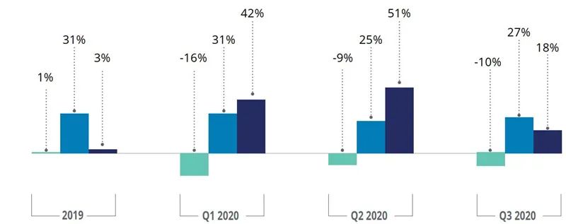 尽管2020年前9个月云市场增势强劲, 但预计未来几个季度将在一定程度上放缓。然而, 在两项因素的驱动下, 云增长的放缓速度可能低于市场预期。首先, 尽管不大可能出现2020年初的大规模封锁,但局部疫情的突然爆发以及更加本地化的封锁措施, 仍将推动随时随地办公模式和云增长。其次,从长远的角度, 许多员工和雇主认为疫情下被迫采取的随时随地办公模式行之有效。15例如, 西门子允许员工在合理可行的情况下, 每周两到三天采用随时随地办公模式;这项政策适用于43个国家及地区125个办事处的逾14万名员工。随着企业进一步采用此类随时随地办公模式, 对云服务的需求或将持续加大。