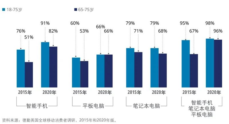 ▲英国的数字设备(笔记本电脑除外)拥有量代际差距正在缩小长期以来,尽管视频通话所需的设备(笔记本电脑、智能手机和平板电脑)已经普遍存在,但在65岁以上的人群中,此类设备的拥有量却并不算高。但上图所示,这种情况已在发生改变。2015年,65至75岁的英国人中,三分之一的人没有可支持医疗视频通话的设备。到2020年,随着越来越多的老年人购买平板电脑,尤其是智能手机,这一数字已降至4%。
