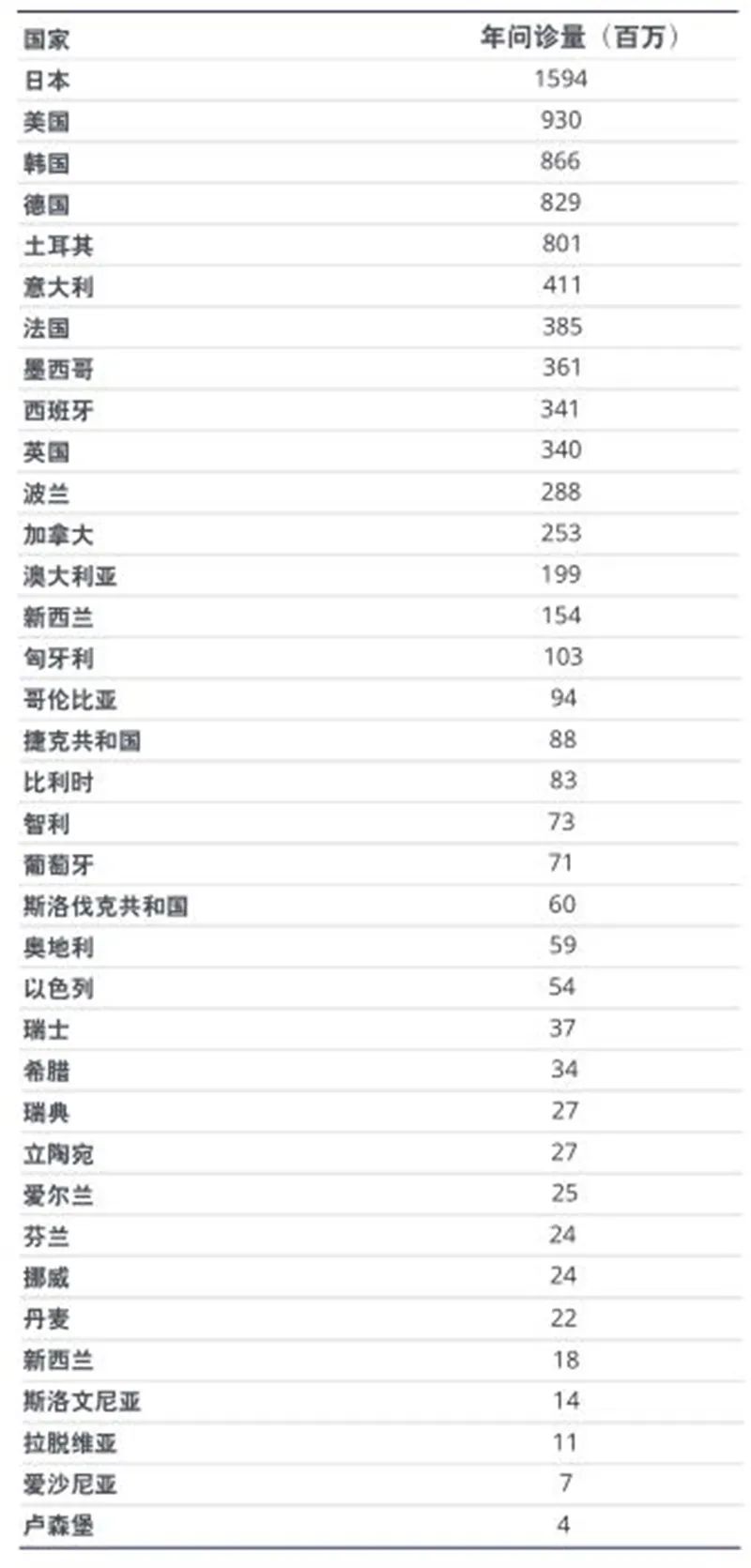将每个国家的问诊总数乘以该国的单次问诊平均费用,各国问诊费用总计约5,200亿美元。