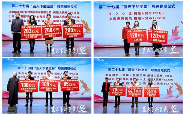 上海的气温已入寒冬,但活动现场的慈善暖流温暖着每一个人的心。现场的爱心企业和爱心人士分别向上海市慈善基金会捐赠善款,用于慈善公益事业。上海柏荟医疗科技集团股份有限公司捐赠203万元、上海南方国际购物中心有限公司捐款200万元、上海柘中集团股份有限公司捐款200万元、BD心追捐款120万元、上海惠元医院捐款120万元、上海晨光文具股份有限公司捐赠100万元、上海开天建设(集团)有限公司捐款100万元、上海长远文化(集团)有限公司捐款85万元、参天制药(中国)有限公司捐赠70万元、虹口区曲阳路街道爱心人士捐款44.7万元、雷根实业集团有限公司捐款36万元。