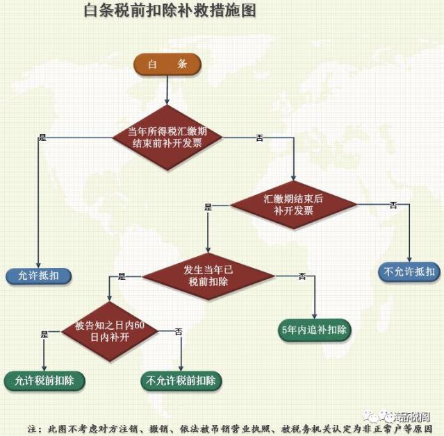 对于未取得合法凭证,而是以白条入账进行税前扣除后,如何补救的问题,《关于企业所得税若干问题的公告》(国家税务总局公告2011年第34号)第六条,《企业所得税税前扣除凭证管理办法》(国家税务总局公告2018年第28号)第十三条、十五条、十七条等条款作了详尽的规定,总结如下图: