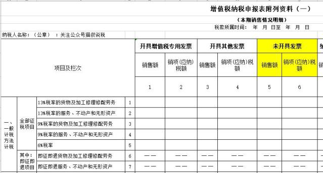 我们知道,一般纳税人的增值税申报表附表(一)中,第5、6列“未开具发票”就是专门用来填报未开具发票的收入,如下图: