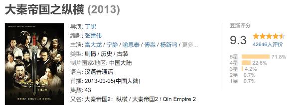 《大秦帝国之纵横》(2013)三部剧集在豆瓣的评分分别为9.3分、9.3分、8.5分,在一众大平台大IP流量言情古偶剧中,这样一个“苦大仇深”的历史剧系列简直就是游离在所谓市场规律之外的一朵奇葩。