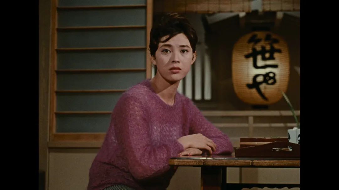《小早川家之秋》· 1961《小早川家之秋》,是小津色彩感最好的一部影片。父亲(中川雁治郎演)带全家前往岚山纪念亡妻,回来后一家子聚在一起。小津先给了一个走廊空镜头,温馨木色,一盏悬挂的蓝灯,再给蓝灯一个特写镜头,然后转到一家子坐在榻榻米上吃饭谈笑,其乐融融,父亲居中、面对观众,子女分坐左右,好似一幅全家福。切换镜头,父亲站起来去睡觉,小女儿突然回来叫:“父亲倒下了……”是心肌梗死……救活了……女儿们喜极而泣。小津设置了一个悬念,父亲被救活了,与孙子玩捉迷藏,趁女儿不注意,溜出去会情妇。切换镜头,父亲去世了,情妇对着他轻轻摇动着扇子,自言自语说,分开了19年,以为可以陪伴他的晚年,才相遇就死了……而前面,全家的相聚,不过是死亡与离散前的最后一次团圆。圆满的同时,意味着空无。