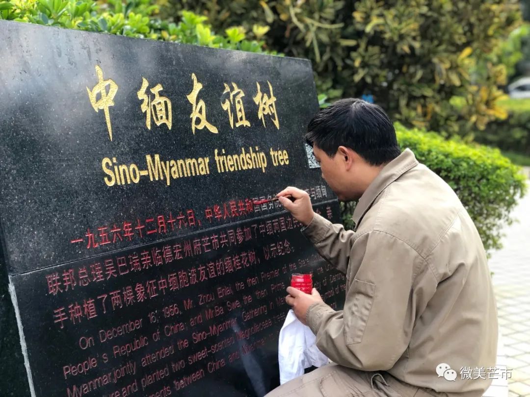 △工作人员为纪念碑上的文字添色 (王悦 摄)1957年12月,国务院副总理陈毅在陪同周恩来总理访问缅甸时曾赋诗一首盛赞中缅两国友谊——《赠缅甸友人》:“我住江之头,君住江之尾。彼此情无限,共饮一江水”。如今,这朗朗上口的诗句已镌刻在芒市宾馆院内的景观小品上,铿锵有力地“叙说”着中缅两国的深厚胞波情谊。