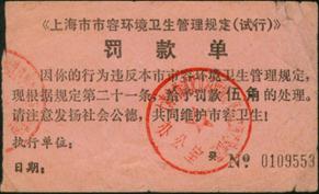 违反市容卫生管理规定的罚款单到了1988年国庆前,黄浦区针对区内原有的建筑垃圾临时堆放点,实行集中在一个室内建筑垃圾中转站进行倾弃、清运,浦西区域原有的上百个堆放点全部撤除。至1990年,黄浦区环卫局在南苏州路334号建造了上海第一座全封闭式的建筑垃圾中转站,站内装有喷雾除尘设备,可堆放垃圾1200吨,日转运量320吨。同时其他区环卫管理部门也开始对建筑垃圾临时堆放点进行了撤并,并加强管理。