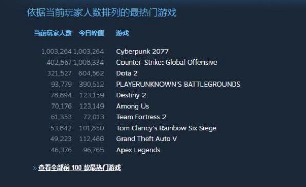 从2012年发布首个预告片至今,立项8年、跳票3次,在2020年末踩线发布的《赛博朋克2077》,上线不到3小时,在线人数便超越《dota2》《反恐精英:全球攻势》等老兵,达100万玩家同时在线。