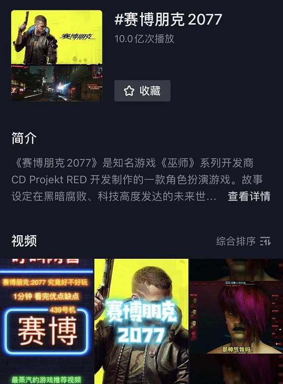 目前CDPR已经在B站开通账号,并累计百万粉丝。CDPR的B站账号共上传了包括预告片在内的将近200个视频,其中还包括专属节目《火线夜之城》。B站也在通过主页推荐、联动直播等方式,为《赛朋》持续引流。除B站外,其他短视频平台同样值得关注。抖音上已经有主播制作《赛朋》超跑彩蛋合集,目前累计播放量3200万。从站内总数据来看,#赛博朋克2077#话题下视频数约为2.2万个,播放次数达10亿。