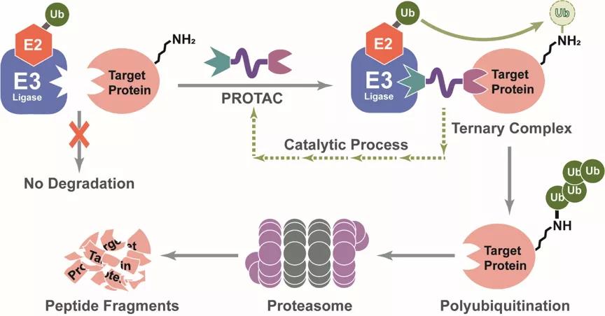 PROTAC(PROteolysis TArgeting Chimera)是一种双功能小分子化合物,该小分子化合物类似一个跷跷板,一端是结合靶蛋白的配体,另一端是结合E3泛素连接酶的配体,配体之间通过一个linker连接,形成一个复合物,拉近靶蛋白与E3连接酶从而促进靶蛋白的泛素化,使其进入泛素-蛋白酶体降解途径,达到降解靶蛋白的目的。