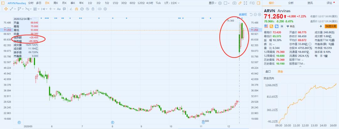 12月14日,Arvinas发布了ARV-110针对前列腺癌患者的临床数据。同时,还公布了其产品管线中另一款药物ARV-471针对乳腺癌患者中的I期积极疗效数据。利好消息一出,Arvinas以暴涨95%收盘,市值达到23.67亿美元。