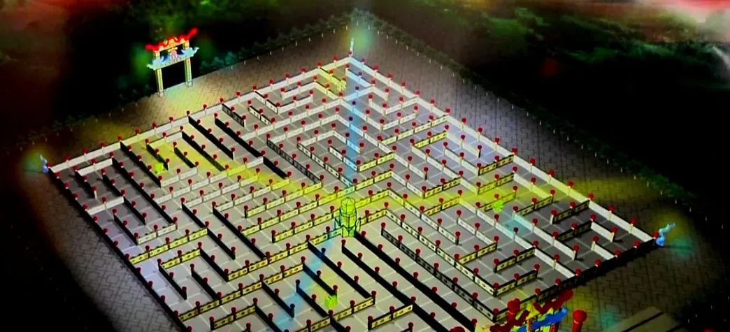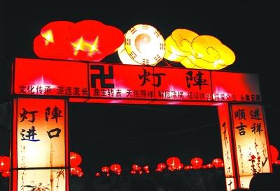 卍字灯俗花灯在布阵时,进、出口正面各扎一道龙门,饰以彩灯,按灯谱在空地埋栽木杆,横竖各19排,每排19杆,间距一般为2米,呈正方形,杆高2米,共361根,杆与杆之间按照图谱用幕布遮蔽。在主场正中竖一主杆,高8.10米,上挂大型花灯,其余杆上挂360个小型花灯,象征农历360天。