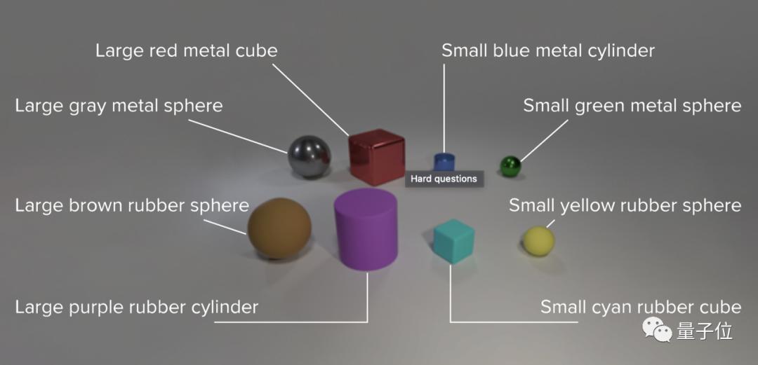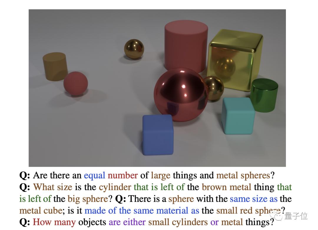 2016年,李飞飞等人提出了组合语言和基本视觉推理(CLEVR)数据集,要求AI回答由计算机生成的简单3D形状图像相关问题。