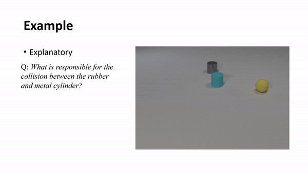 甚至还有些问题是视频中没有发生的(反事实),比如:没有青色圆柱体,将不会发生什么?[a]球体和立方体碰撞, [b]球体和青色圆柱体碰撞, [c]立方体和青色圆柱体碰撞。