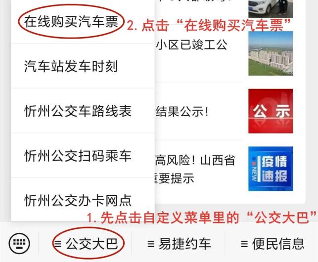 2.点击公众号自定义菜单里“公交大巴”,再点击“在线购买汽车票”即可。