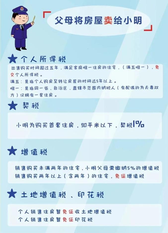 政策补充:个人所得税:按照《财政部国家税务总局关于个人无偿受赠房屋有关个人所得税问题的通知》(财税〔2009〕78号)第一条规定,符合以下情形的,对当事双方不征收个人所得税: