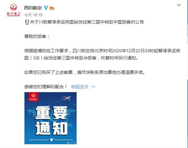 12月22日晚,四川航空公告,根据疫情防控工作要求,四川航空自北京时间2020年12月22日24时起暂停承运英国(GB)始发经第三国中转赴华旅客,恢复时间另行通知。